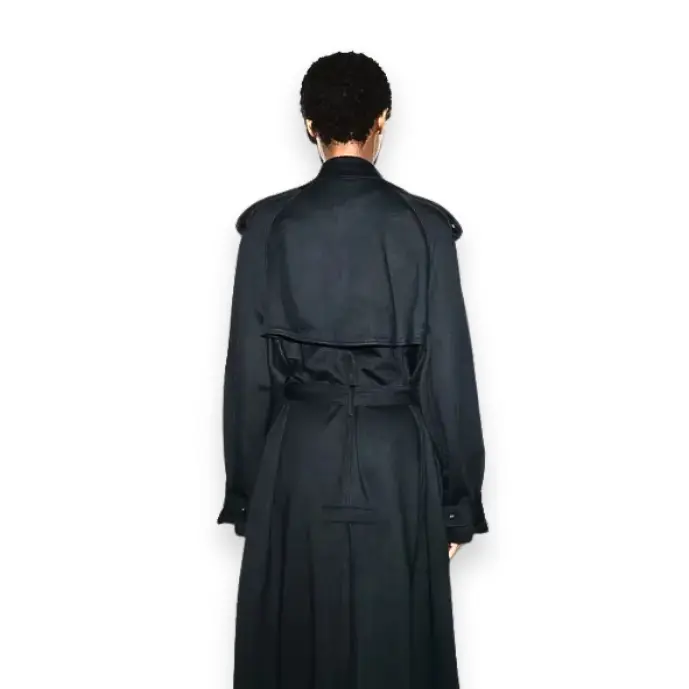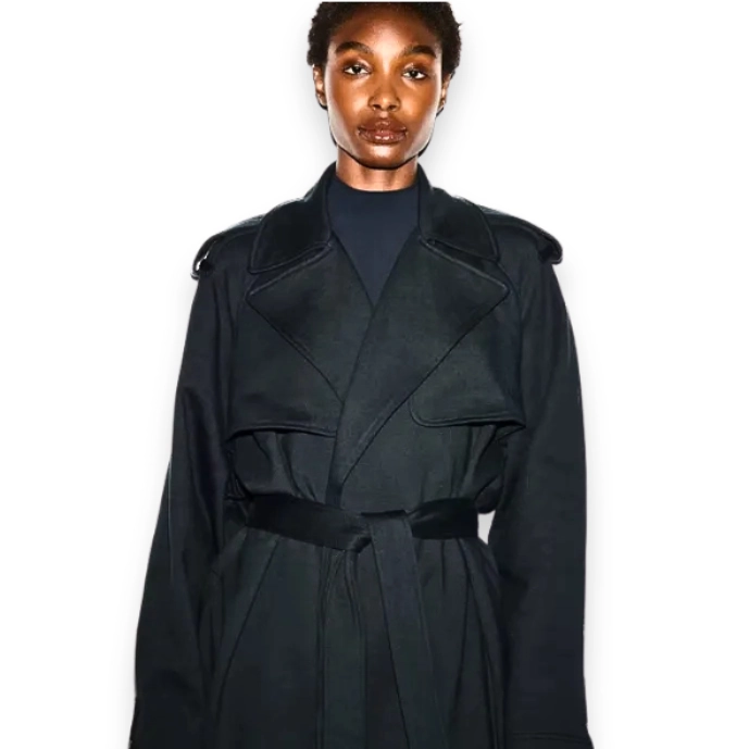 - Signature Details: Pointed collar, welt pockets, storm flaps & tie belt for versatile styling.